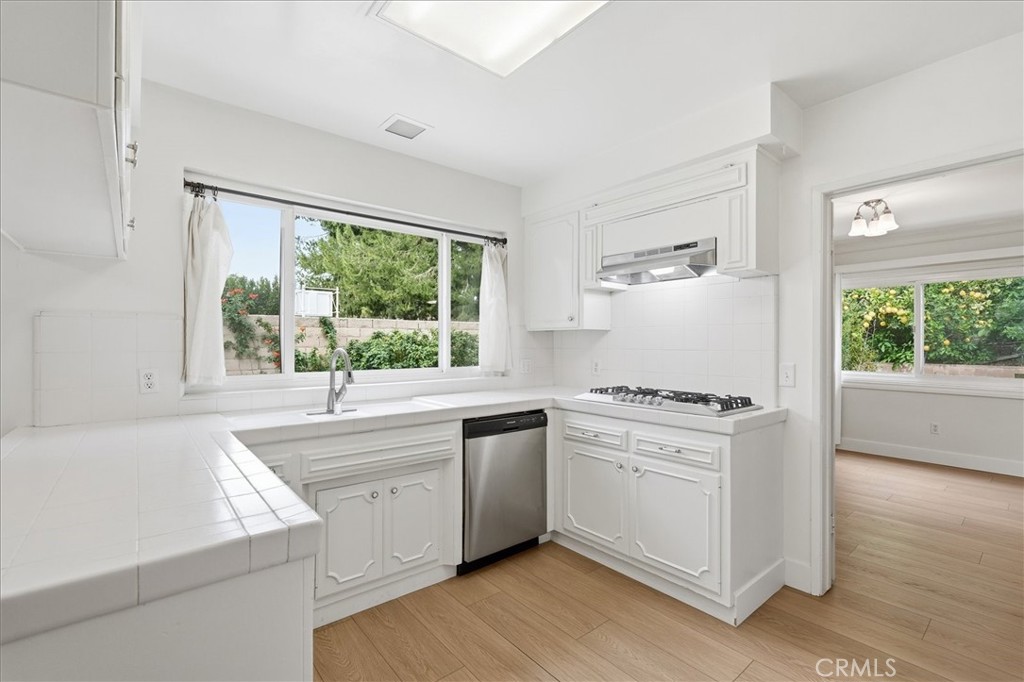 Beautiful single level home in a desirable Chatsworth cul-de-sac, offering a thoughtful layout and inviting charm. A large entryway welcomes you into the foyer and leads into a spacious living room featuring a cozy fireplace, wet bar, and two large skylights that allow for natural light throughout the day. Light-colored luxury vinyl flooring and neutral walls create a bright and welcoming atmosphere.The kitchen offers white tile countertops and a breakfast/eating area as well as an additional dining space. Updates completed in 2024 include brand-new kitchen appliances - oven, stove, range hood, and dishwasher, along with installing vinyl plank flooring, complete interior repaint, and a new heating and air conditioning unit for year-round comfort. Adjacent to the kitchen is an ideally located half bathroom, laundry room with newer washer and dryer, and direct access to the two-car garage for everyday convenience. The thoughtful floorplan balances spaciousness with comfort, with the main living areas separated from the bedrooms for added privacy. The primary bedroom includes a walk-in closet with built-in organizer and an ensuite remodeled bathroom with plenty of countertop area and updated cabinetry. Down the cabinet-lined hallway are two generously sized bedrooms, one office/bedroom, and a full hallway bathroom. Outside, the backyard provides ample space to enjoy, featuring grassy areas, a hardscape side yard with storage shed, and a central patio area ideal for outdoor entertaining and relaxation. The generous front yard adds to the home's sense of openness and curb appeal and there is a long driveway for additional parking. Situated on a peaceful cul-de-sac, nearby elementary & middle schools, shopping, this home combines modern updates, comfort, and a highly desirable location.